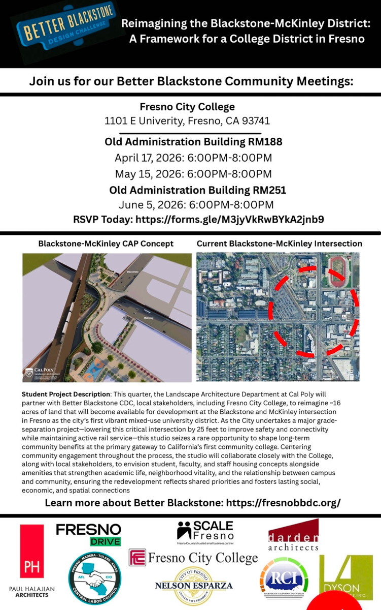 On Friday, I went to a workshop of the Better Blackstone community group. They were sponsoring a study by architecture students from Cal Poly where the goal was generation of ideas for community input into a nearby major road construction project. Our two largest roads, Blackstone and McKinley, will be dropped down 25 feet to avoid the at-grade railroad crossings, and this generates opportunity for imaginative area development. Fresno needs the imagination and we wish the students well in coming up with inspiring ideas.